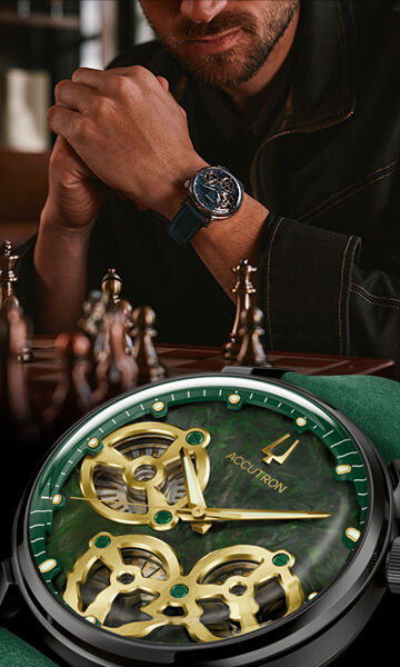 Accutron's Proprietary Electrostatic Movement. The electrostatic energy is created by twin turbines that rotate as a result of human motion at incredible speeds between two electrodes affixed to the movement. The energy, stored in an accumulator, powers two motors; a world’s first electrostatic motor fueling the fluid second hand and a step motor powering the hour and minute hands.